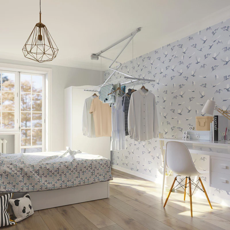 Foxydry Mini este un uscator de rufe inteligent, montat pe tavan, care maximizeaza spatiul si face uscarea rufelor mai usoara. Se poate cobori pana la 1,80 metri de tavan si poate fi oprit la orice inaltime intermediara, permitandu-va sa lucrati intr-o pozitie confortabila, fara a va solicita spatele.